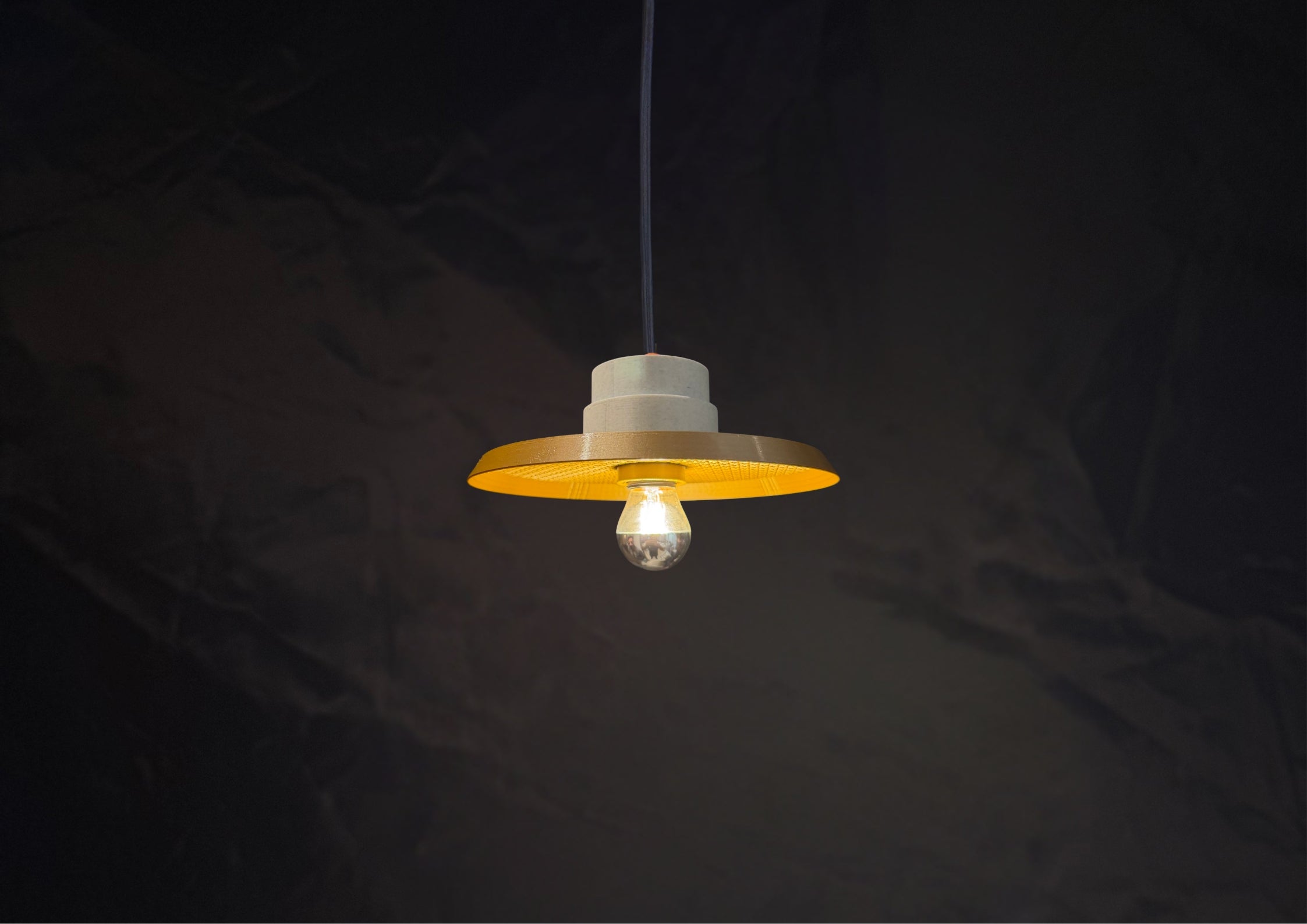 The ORA Drop translates the minimalist, textured disc of its wall-mounted counterpart into a functional 3D-Printed pendant. This light features a wide, elegant brim that frames a central, exposed filament bulb. The intricate grid texture on the shade's surface subtly catches the light, adding depth and character, while the open design casts clear, unobstructed light downwards. It's a piece of modern utility, perfect for illuminating kitchen counters, dining tables, or workspaces with a conscious, simple form.